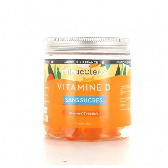 Ces gummies sans sucres de la marque Les Miraculeux contiennent de la vitamine D3 végétale. Elles possèdent un goût mangue et sont formulées sans gluten et sans colorant artificiel. Elles sont également fabriquées en France.