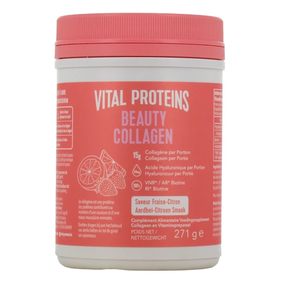 Le collagène est une protéine. Les protéines contribuent au maintien d’une ossature et d’une masse musculaire normales. 1 portion de Vital Proteins Beauty Collagen contient 15 g de collagène (peptides de collagène), de la biotine (ou vitamine B8) et 120 mg d’acide hyaluronique :